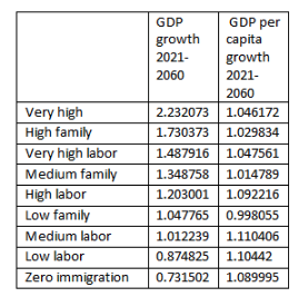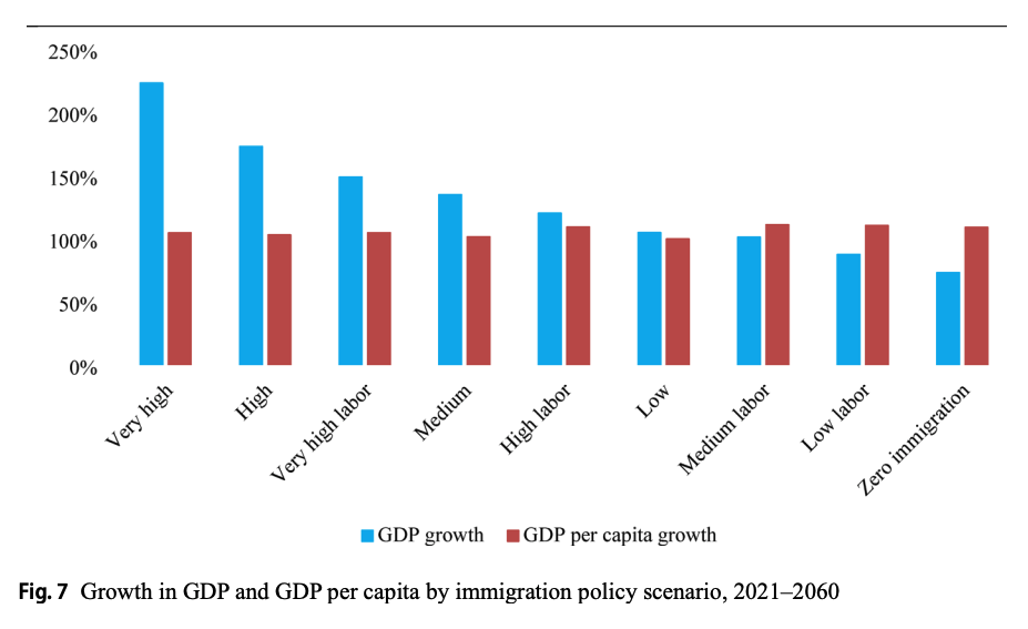 The study looks at economic growth from 2021 to 2060, and concludes that GDP [the blue line] is maximized by mass immigration of families who must work to rent apartments and pay living expenses.