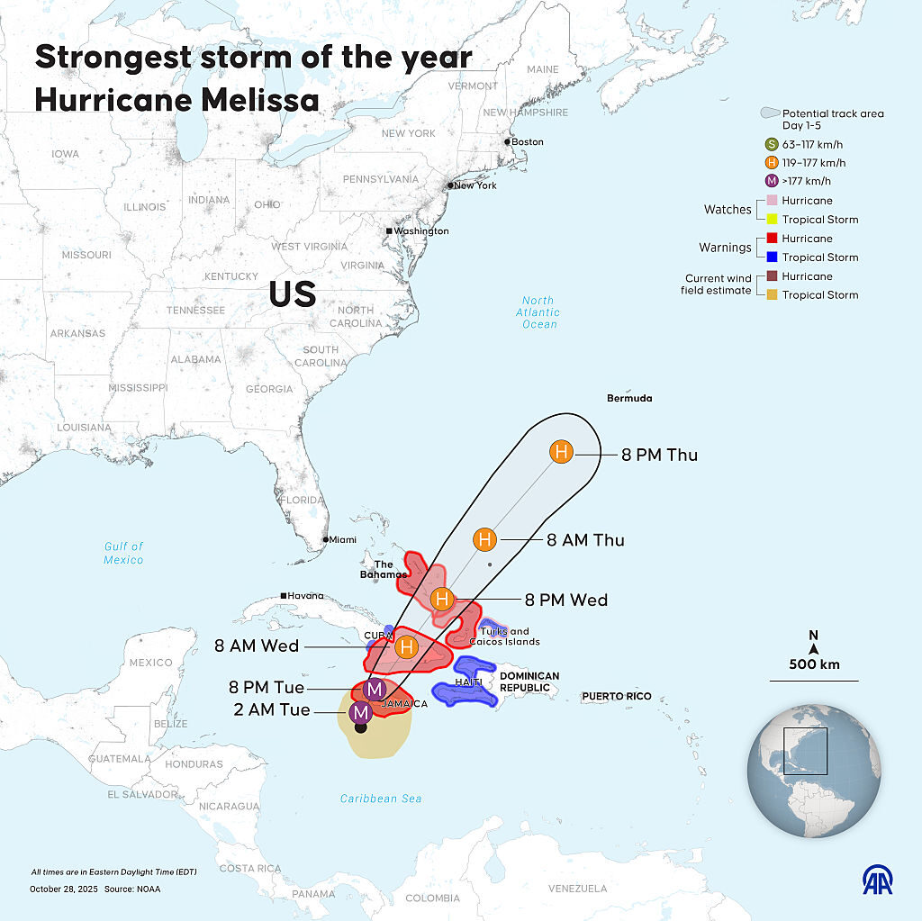 An infographic titled “Strongest storm of the year Hurricane Melissa” shows the path of Hurricane Melissa. (Ufuk Celal Guzel/Anadolu via Getty)