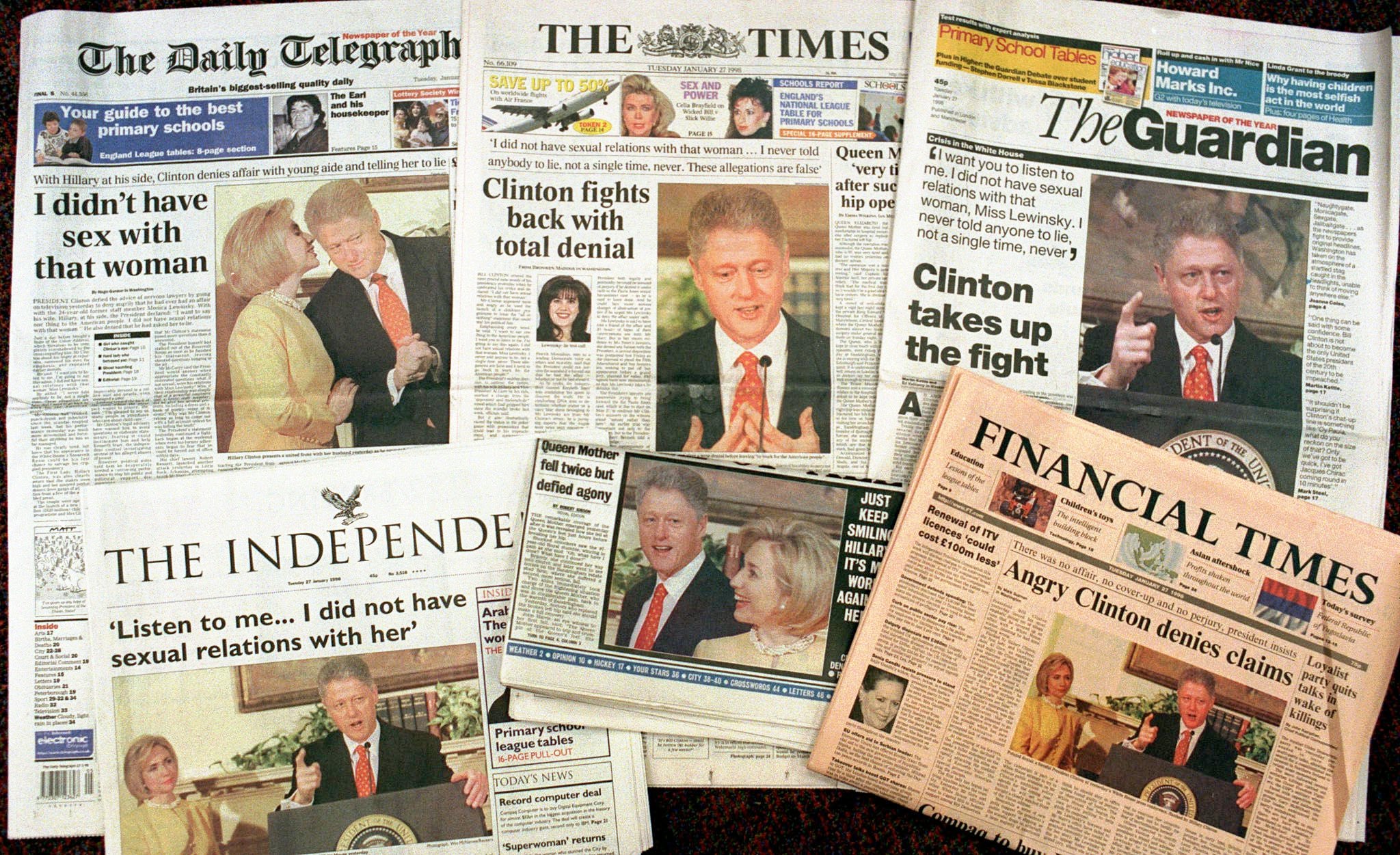 A montage of British daily newspapers published on Jan. 27, 1998, headlining President Clinton’s denial that he has had sex with Monica Lewinsky, which was definitively proven when his DNA was found on Lewinsky’s dress. (AP Photo/Martin Cleaver)
