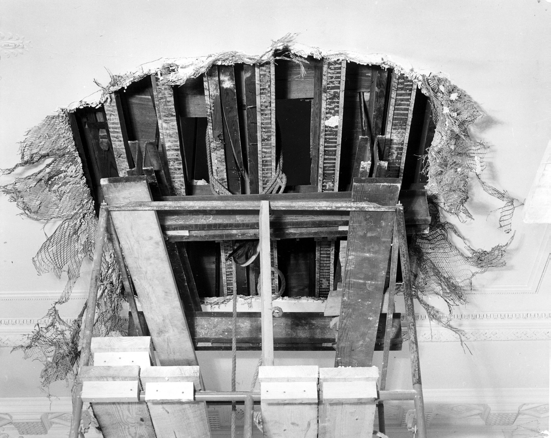 Low angle view of a split beam in the White House lobby’s ceiling, discovered during President Truman’s White House Reconstruction on January 25, 1950. (Smith Collection/Gado/Getty Images)