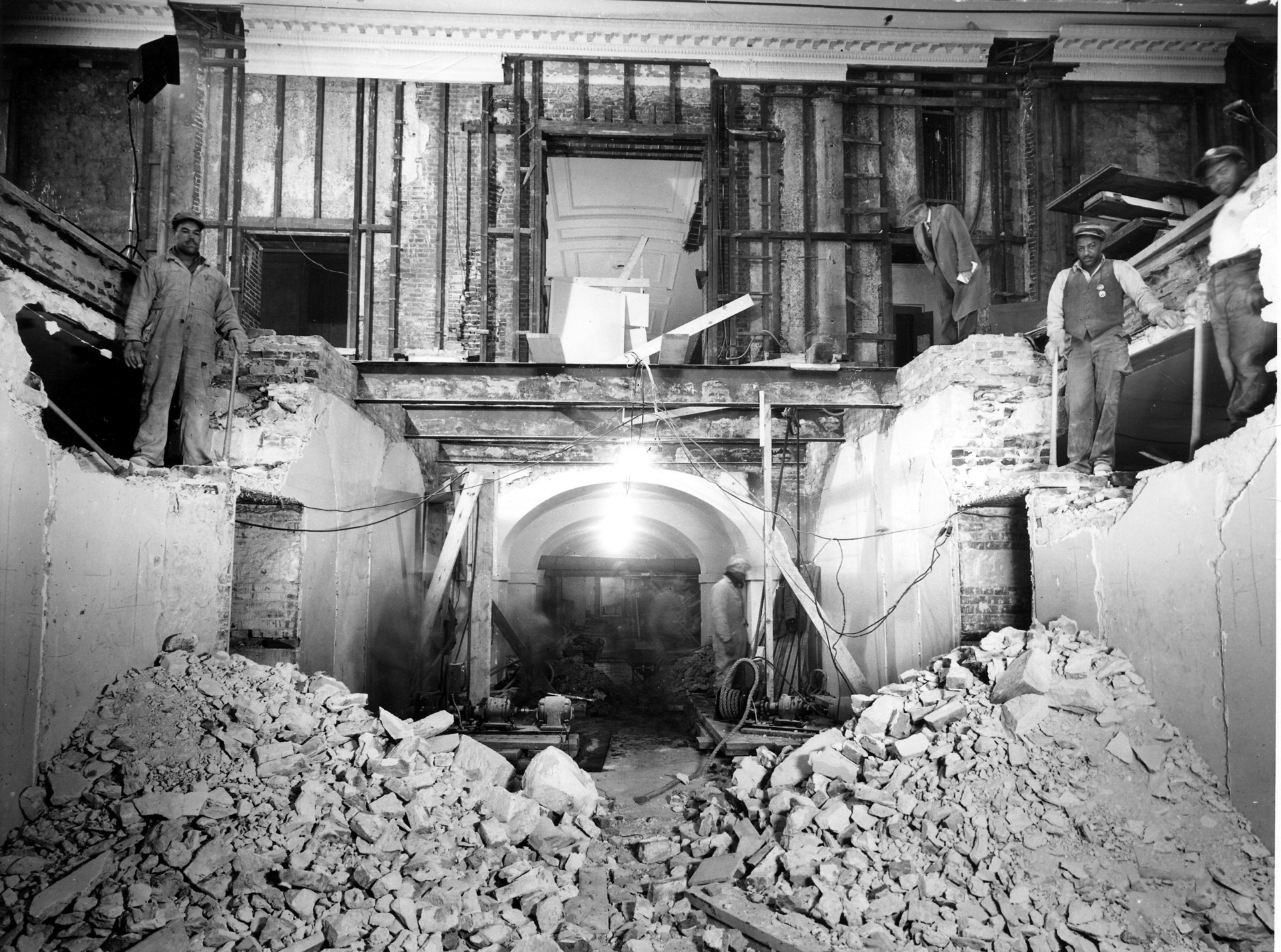 Workmen remove a wall of the White House during renovation on April 12, 1950. (Smith Collection/Gado/Getty Images).
