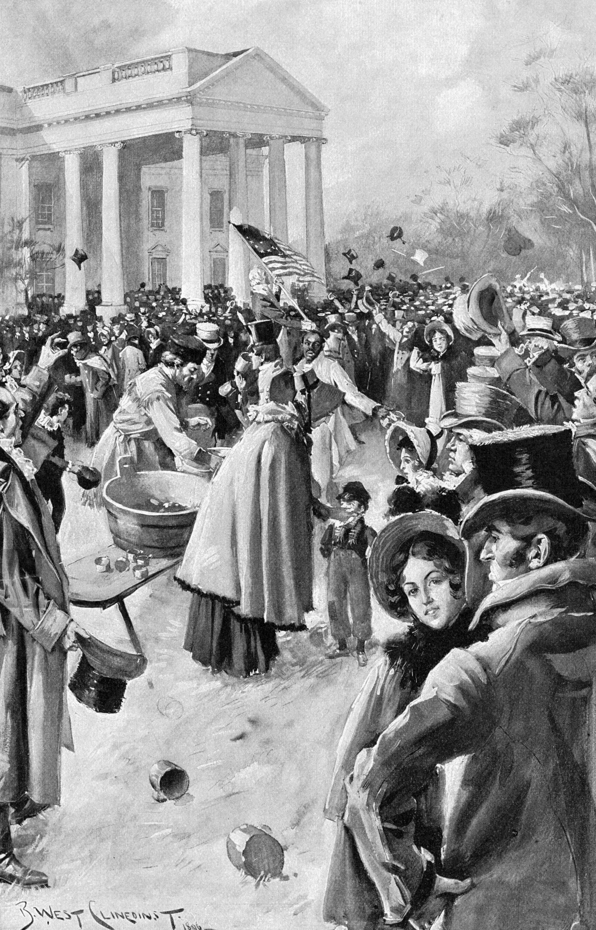 The White House servants put tubs of ice cream and whiskey-spiked punch on the lawn in order to lure the crowd out of the building. One senator described the scene as a “regular Saturnalia.”