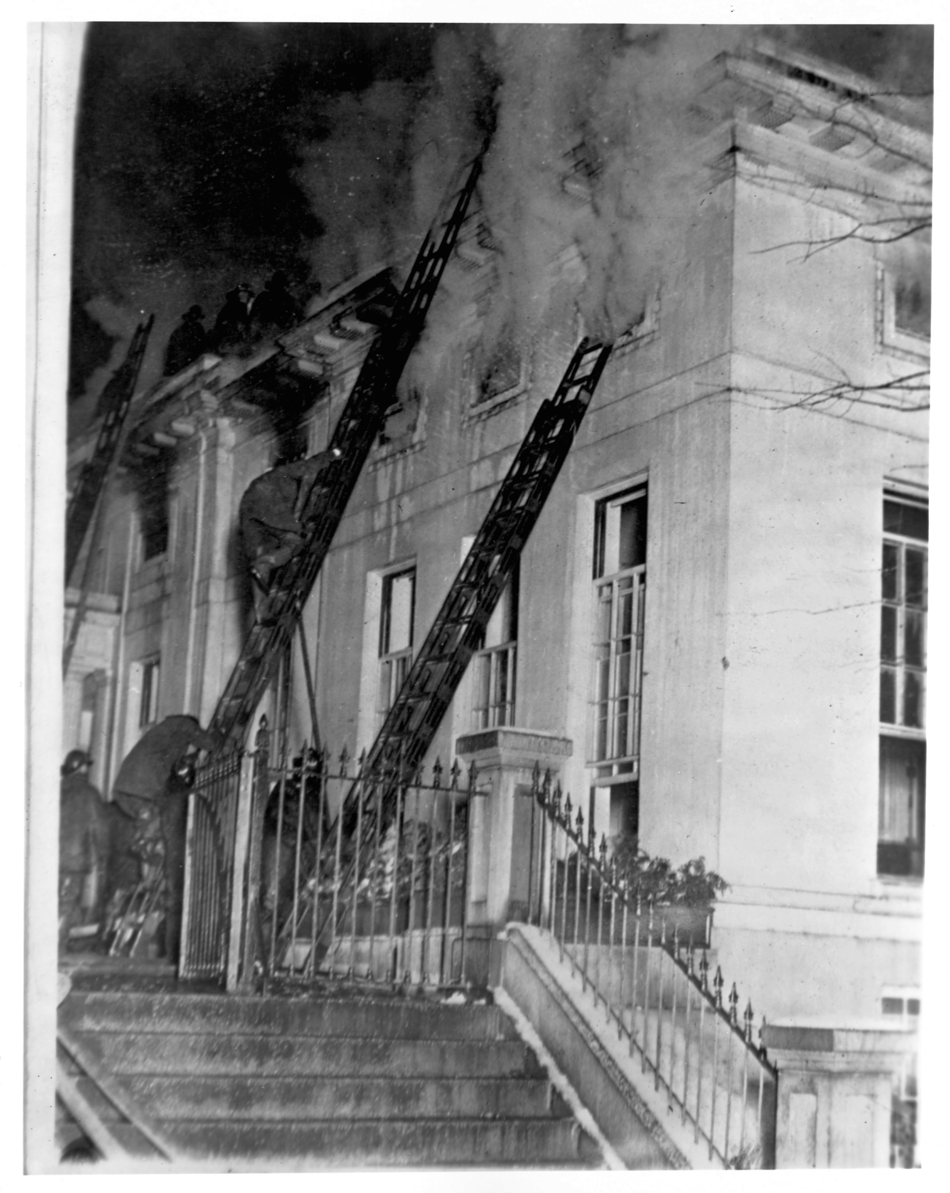 Two firefighters climb a ladder to fight a fire at the White House on December 24, 1929. (H.E. French/Library of Congress/Corbis/VCG via Getty Images)