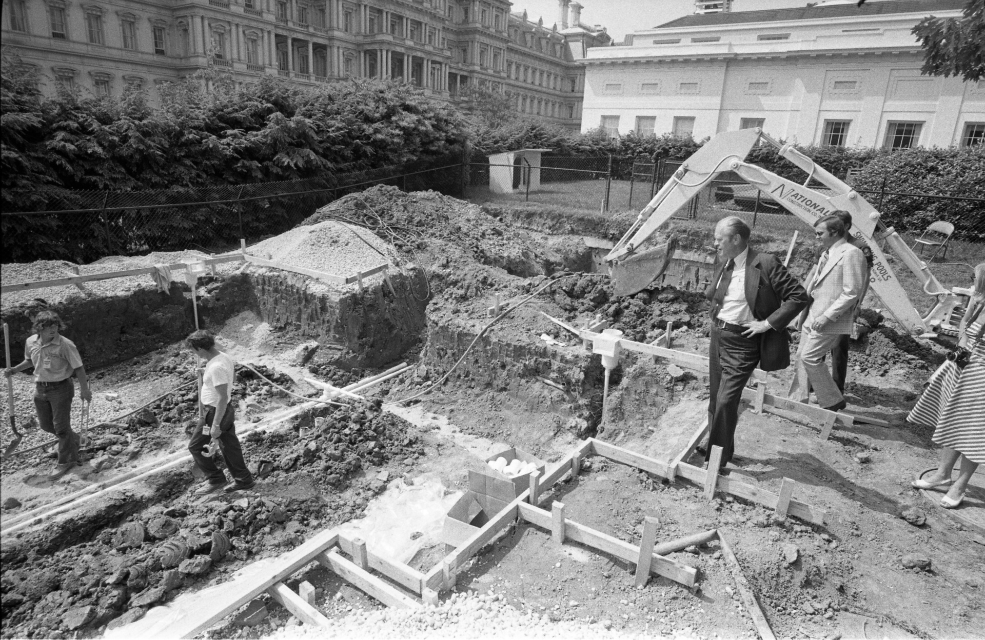 President Gerald Ford inspects the construction site for his White House swimming pool on May 20, 1975. (U.S. National Archives and Records Administration)